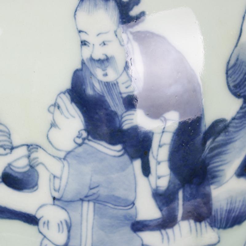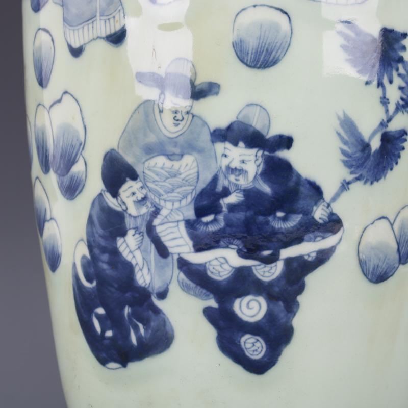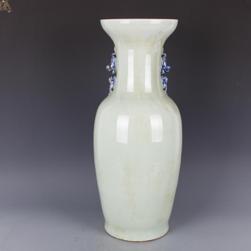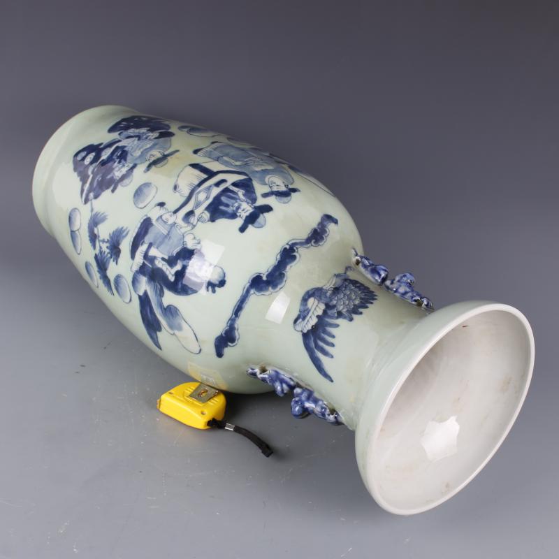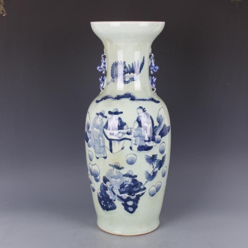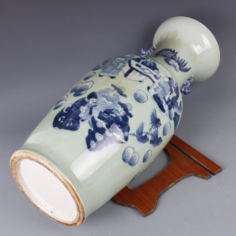 清康熙豆青釉青花人物故事獅耳花瓶手工仿古老貨瓷器擺件古玩收藏1入