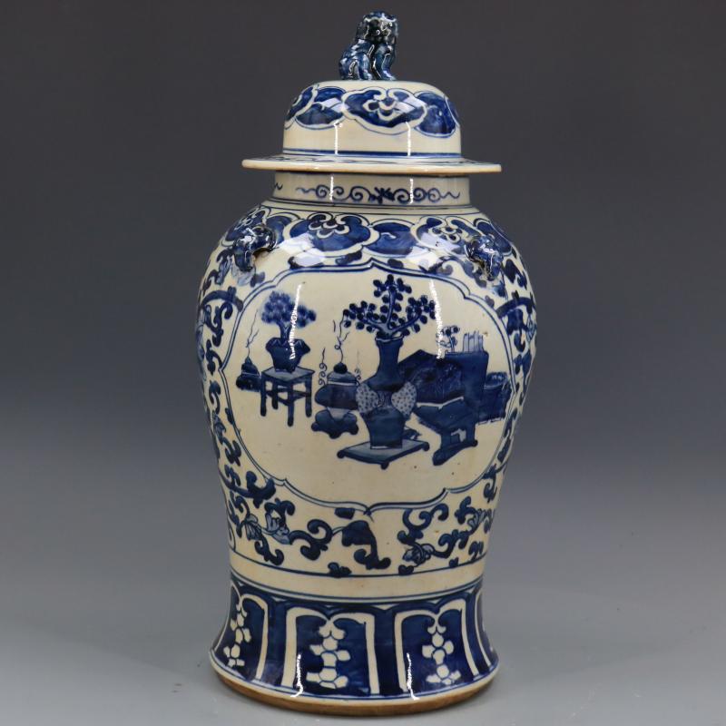 清光緒青花博古花紋獅子頭將軍蓋罐仿古老貨包老瓷器家居古玩擺件1入