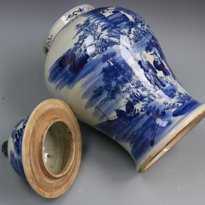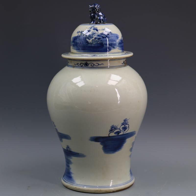 清康熙青花山水人物獅子頭將軍罐仿古工藝品瓷器擺件古董古玩收藏1入