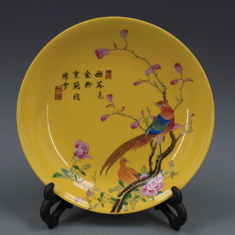 [2]清雍正黃地粉彩花鳥紋盤仿古工藝品瓷器家居裝飾擺件古董古玩收藏1入