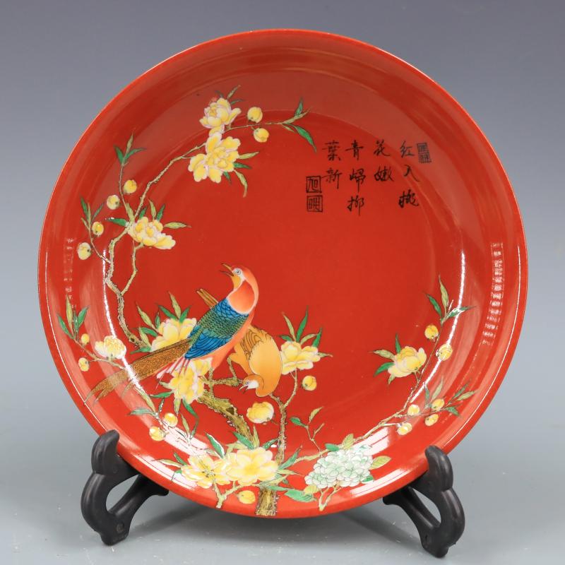 清雍正紅地粉彩花鳥紋盤仿古工藝品瓷器家居裝飾擺件古董古玩收藏1入