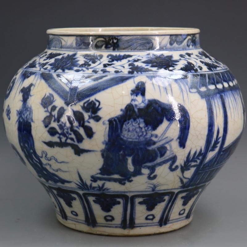 元青花人物故事紋大罐手繪仿古老貨瓷器家居裝飾擺件古董古玩收藏1入