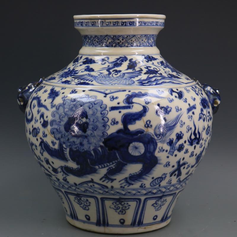 元青花八寶獅子紋狗頭大罐手繪仿古老貨瓷器家居裝飾擺件古董古玩1入