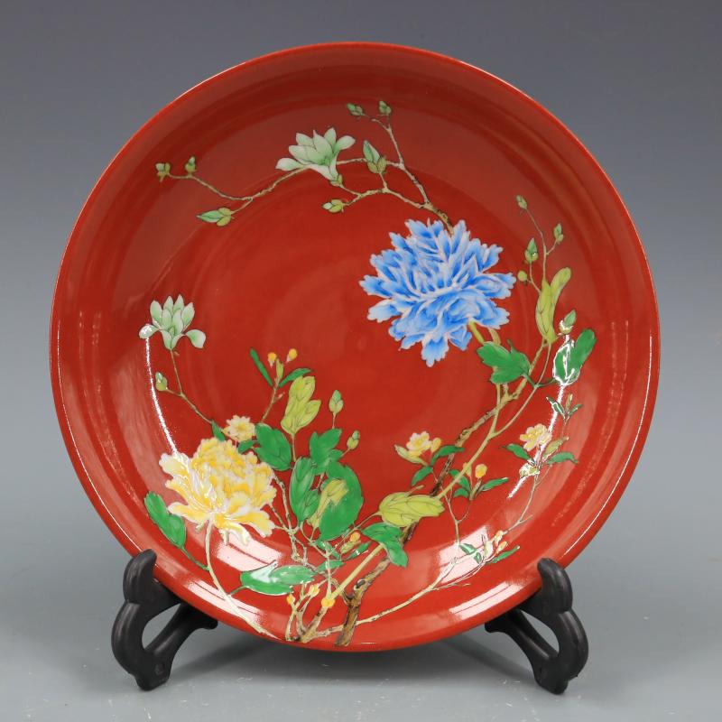 清雍正紅地粉彩花紋盤仿古工藝品瓷器家居裝飾擺件古董古玩收藏1入