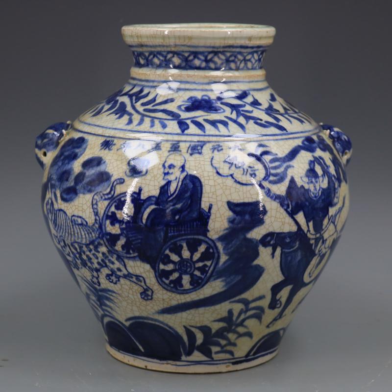 元青花鬼谷子下山圖紋狗頭罐手繪仿古老貨瓷器家居擺件古董古玩1入