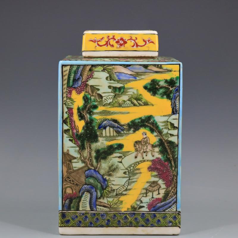 清康熙黃地粉彩人物花鳥四方茶葉罐仿古老貨瓷器家居擺件古董古玩1入