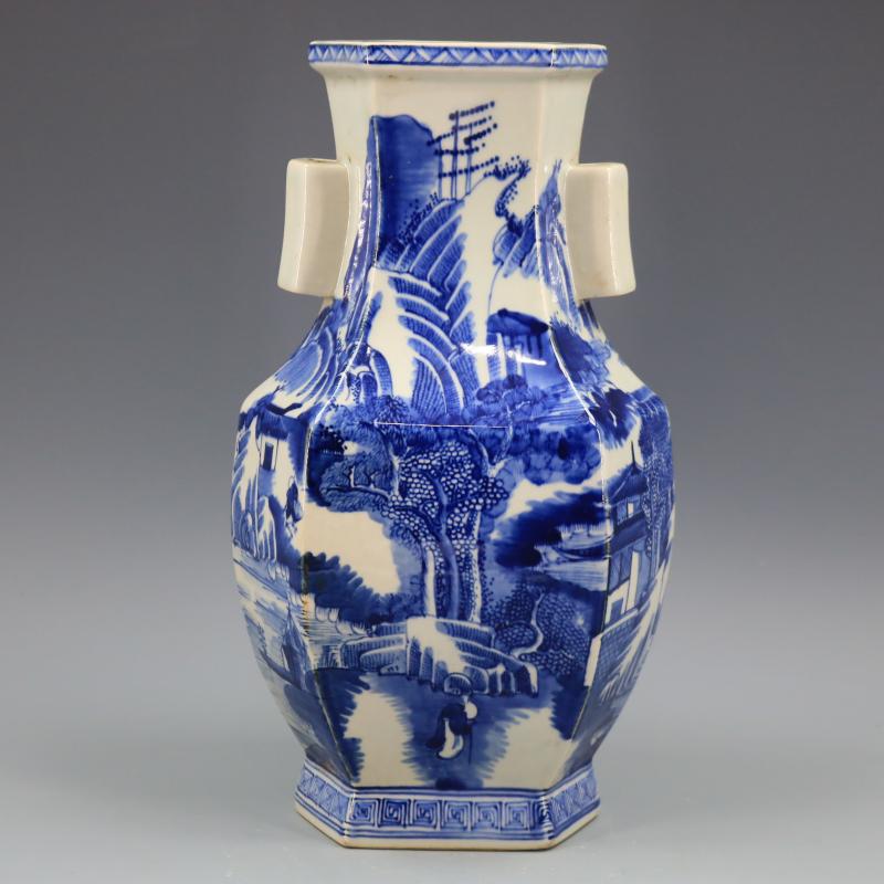 清康熙青花人物山水人六方鑲器瓶純手繪仿古老貨瓷器家居古玩擺件1入