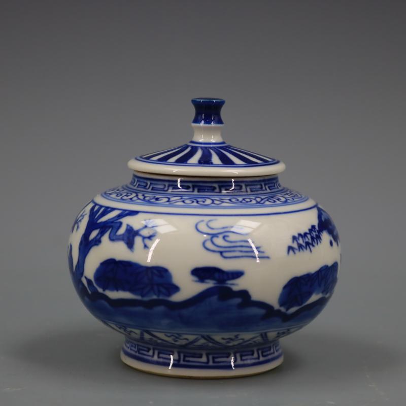 清康熙青花山水全家福小香熏爐仿古工藝瓷器家居擺件古董古玩收藏1入