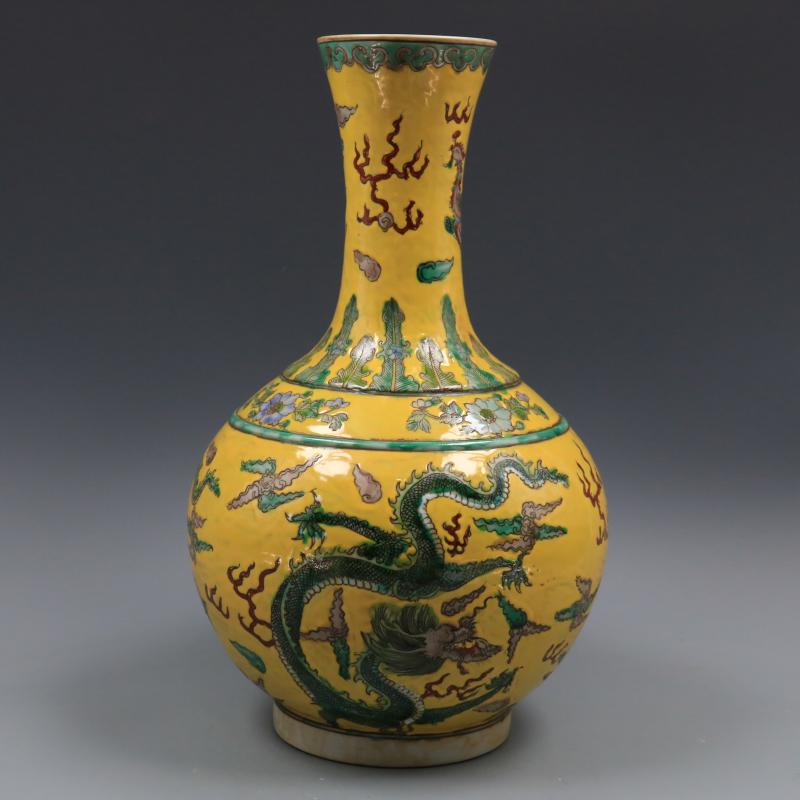 清康熙黃地粉彩云龍紋賞瓶仿古老貨瓷器家居擺件古董古玩老貨收藏1入