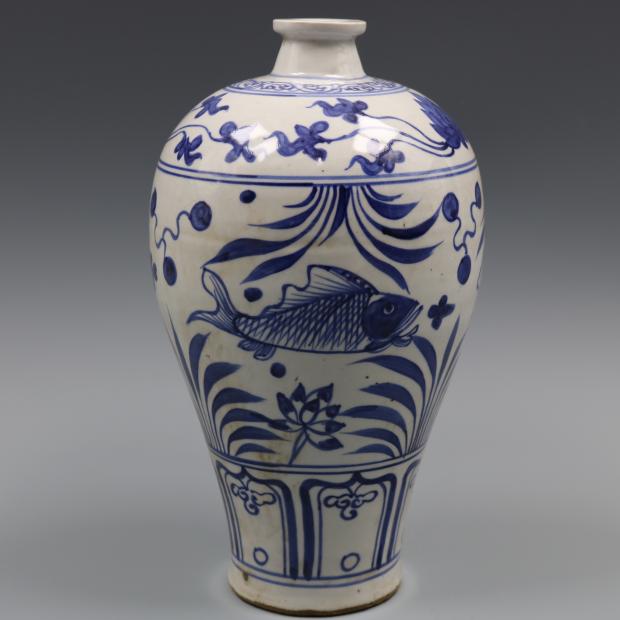 元青花魚藻紋梅瓶手繪仿古老貨瓷器家居博古架裝飾擺件古董古玩1入