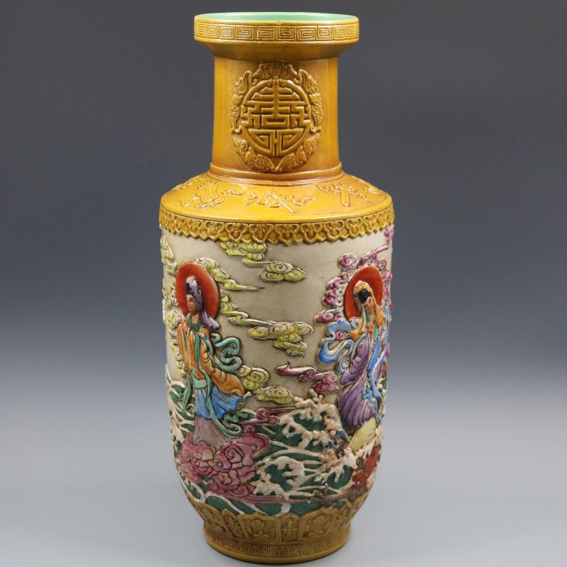 清乾隆浮雕刻粉彩人物棒槌瓶手繪仿古老貨瓷器家居擺件古董古玩1入