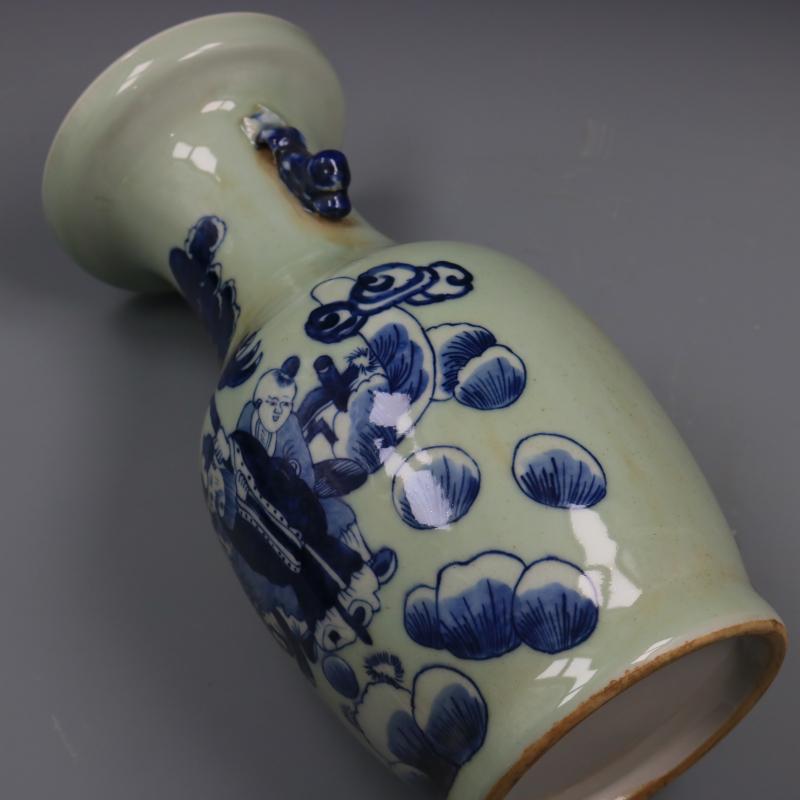 [3]清康熙豆青釉青花人物故事獅耳花瓶手工仿古老貨瓷器擺件古董古玩1入