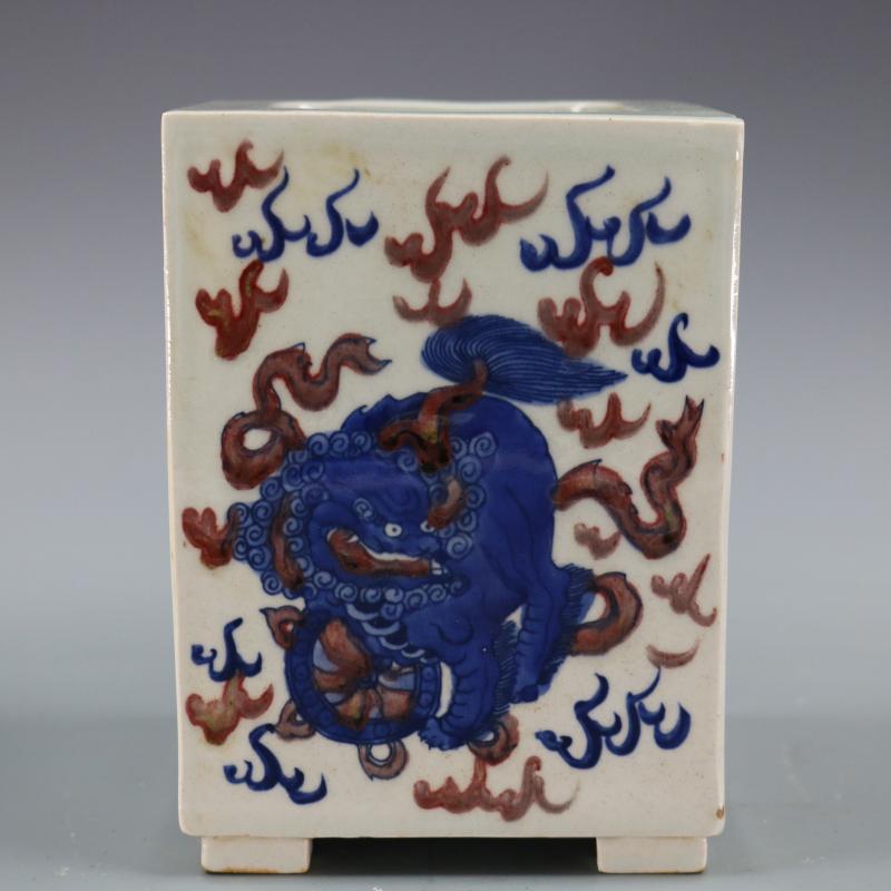 清康熙青花釉里紅獅子紋鑲器筆筒手繪仿古老貨瓷器家居古玩擺件1入