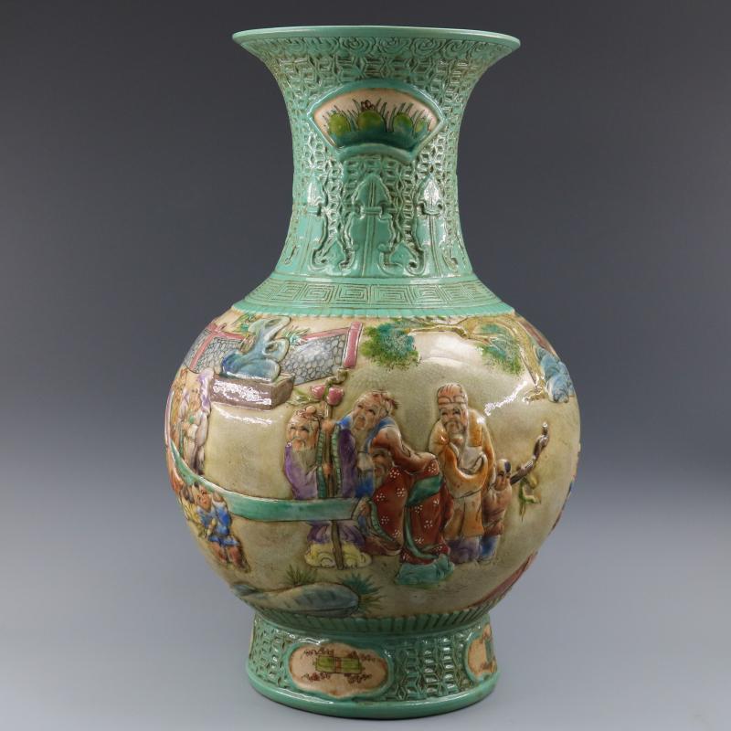 清乾隆浮雕刻粉彩人物魚尾瓶手繪仿古老貨瓷器家居擺件古董古玩1入