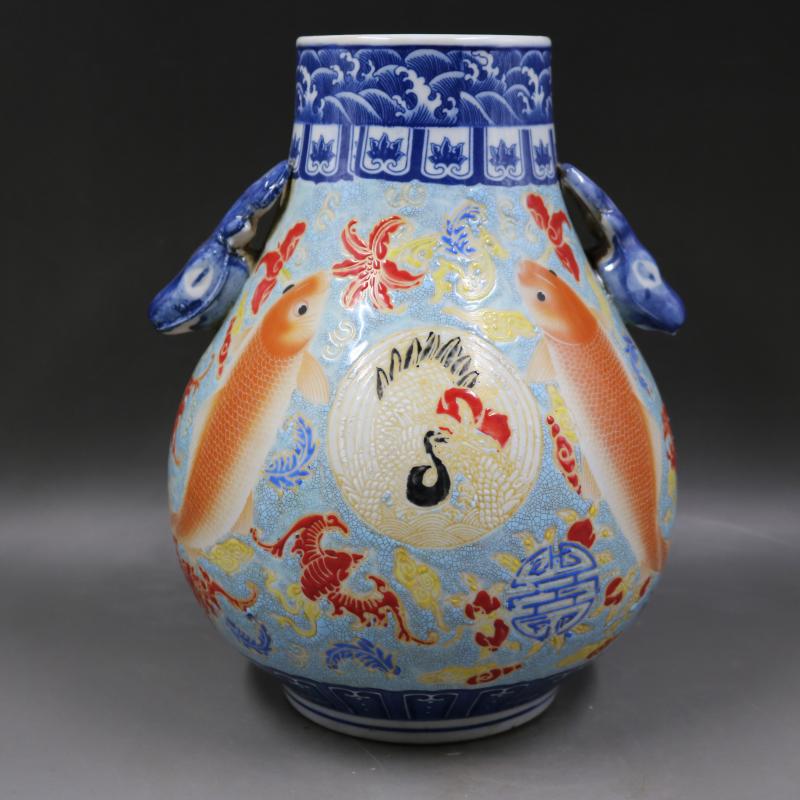 清康熙青花斗彩錦鯉紋夜光瓷鹿頭尊福筒仿古工藝瓷器擺件古董古玩1入