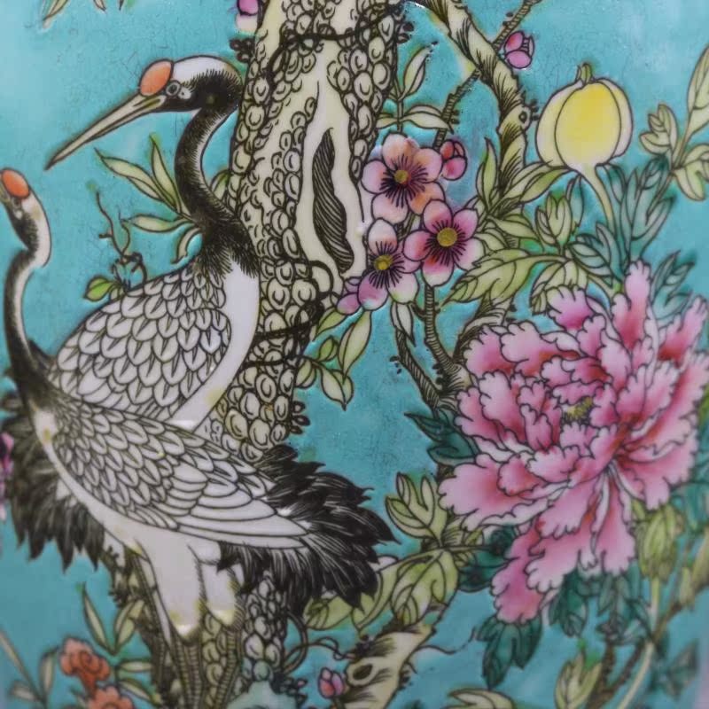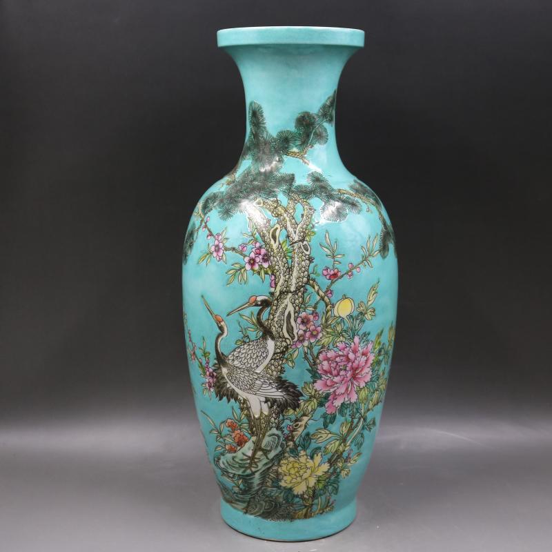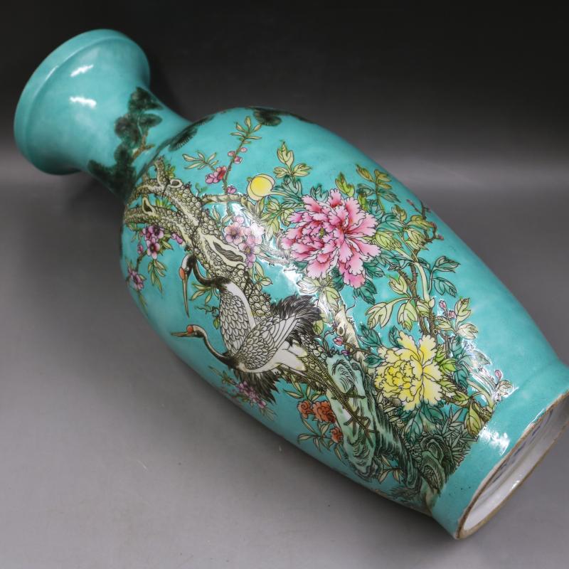清康熙綠地粉彩松鶴牡丹紋魚尾瓶家居裝飾仿古瓷器擺件古董古玩1入