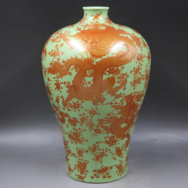 清康熙綠地粉彩穿花龍紋梅瓶仿古工藝瓷器家居擺件古董古玩收藏1入