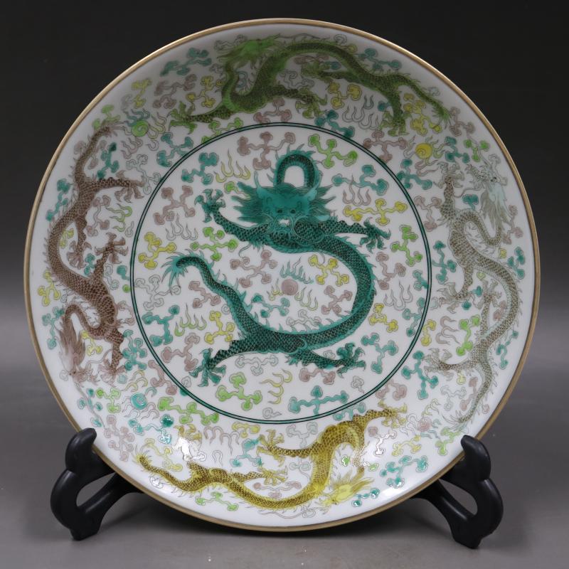 清雍正粉彩穿花龍紋擺件盤手工仿古工藝品瓷器家居古董古玩擺件1入