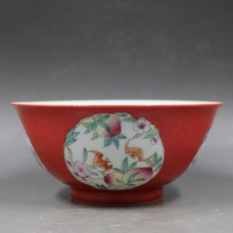 清康熙紅地粉彩福壽紋碗手工仿古工藝品瓷器家居古董古玩擺件收藏1入