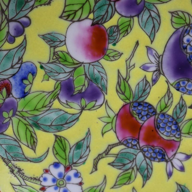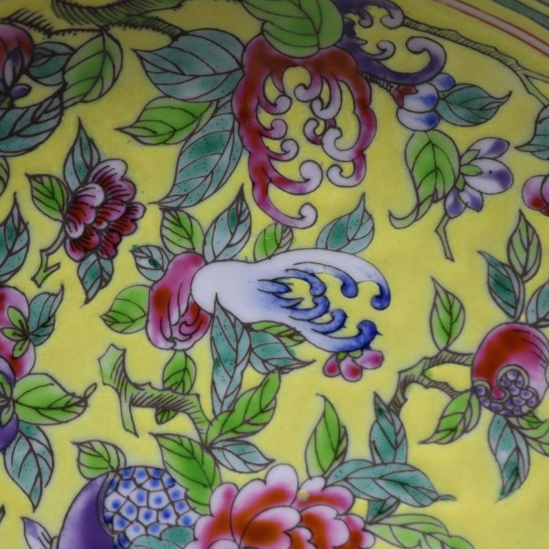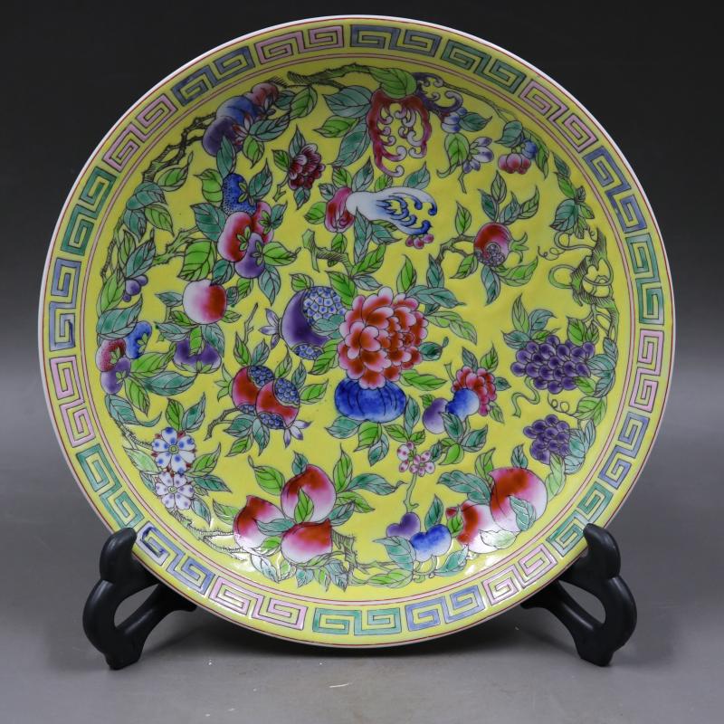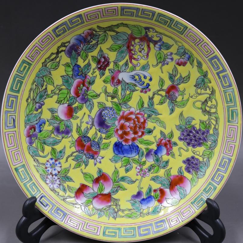 清雍正黃地粉彩福壽三多擺件盤手工仿古工藝品瓷器家居古玩擺件1入