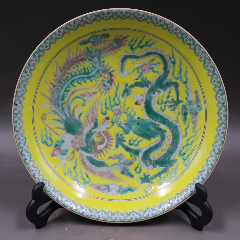 清雍正黃地粉彩龍鳳紋擺件盤手工仿古工藝品瓷器家居古董古玩擺件1入