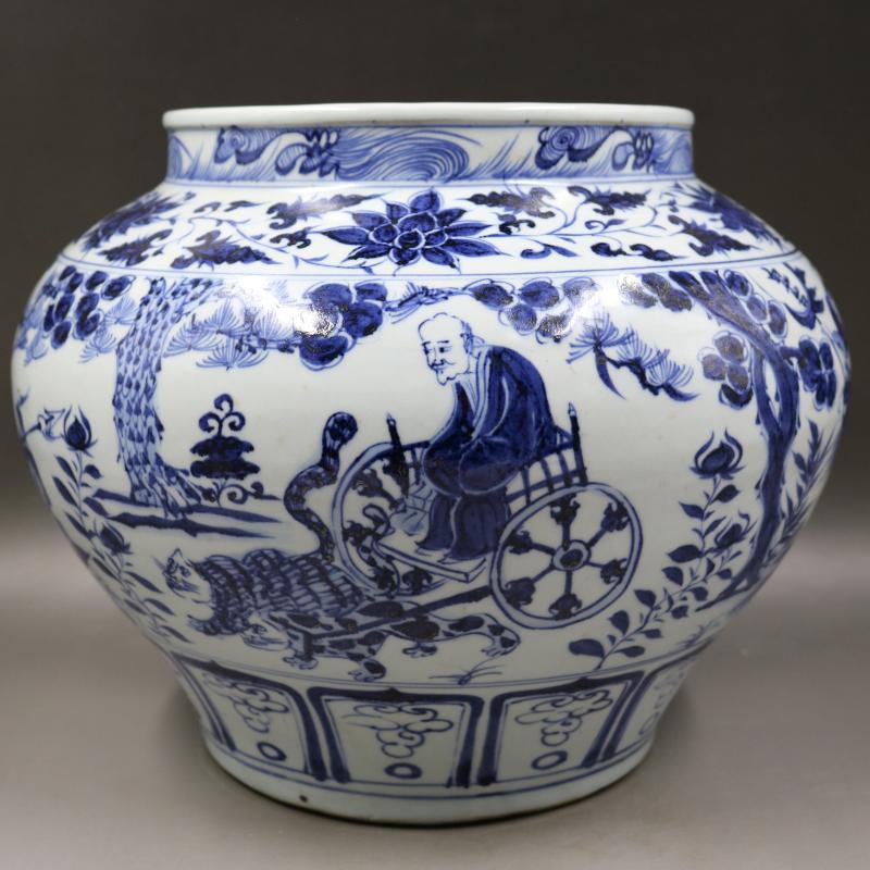 [3]元青花人物鬼谷子下山圖紋大罐手繪家居裝飾復古瓷器擺件古董古玩1入