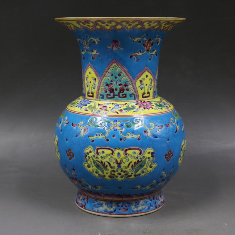 清乾隆藍地粉彩花紋描本金痰盂手工精品仿古瓷器家居裝飾古玩擺件1入