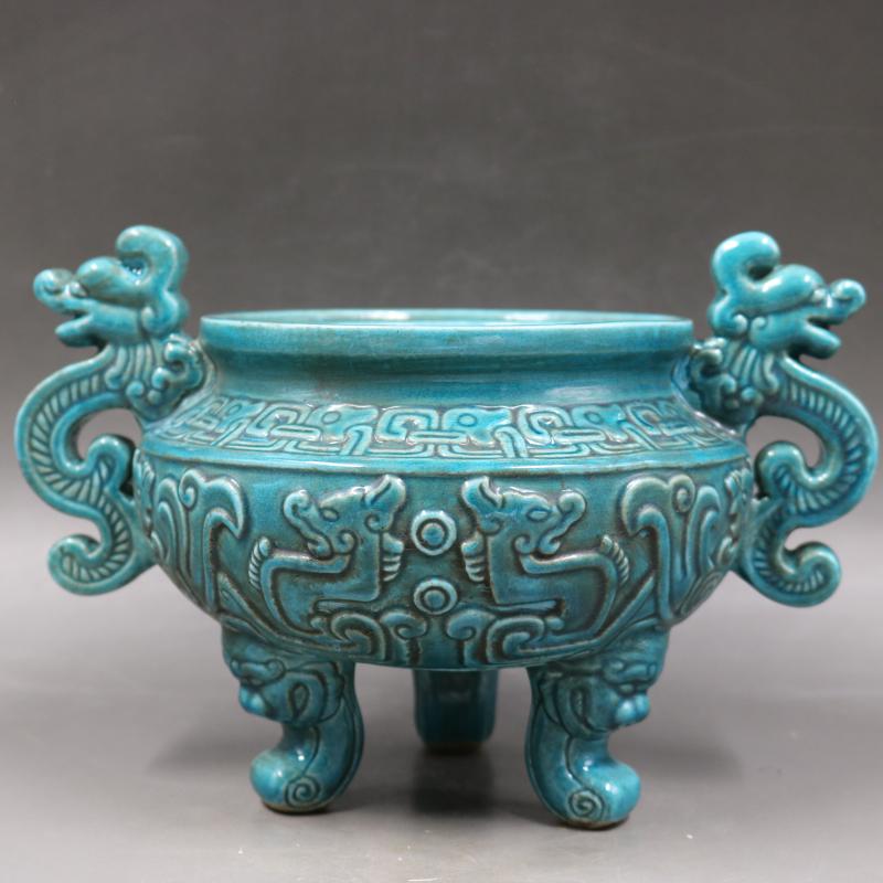 清乾隆浮雕刻雙龍三足香爐手工仿古工藝瓷器家居裝飾擺件古董古玩1入