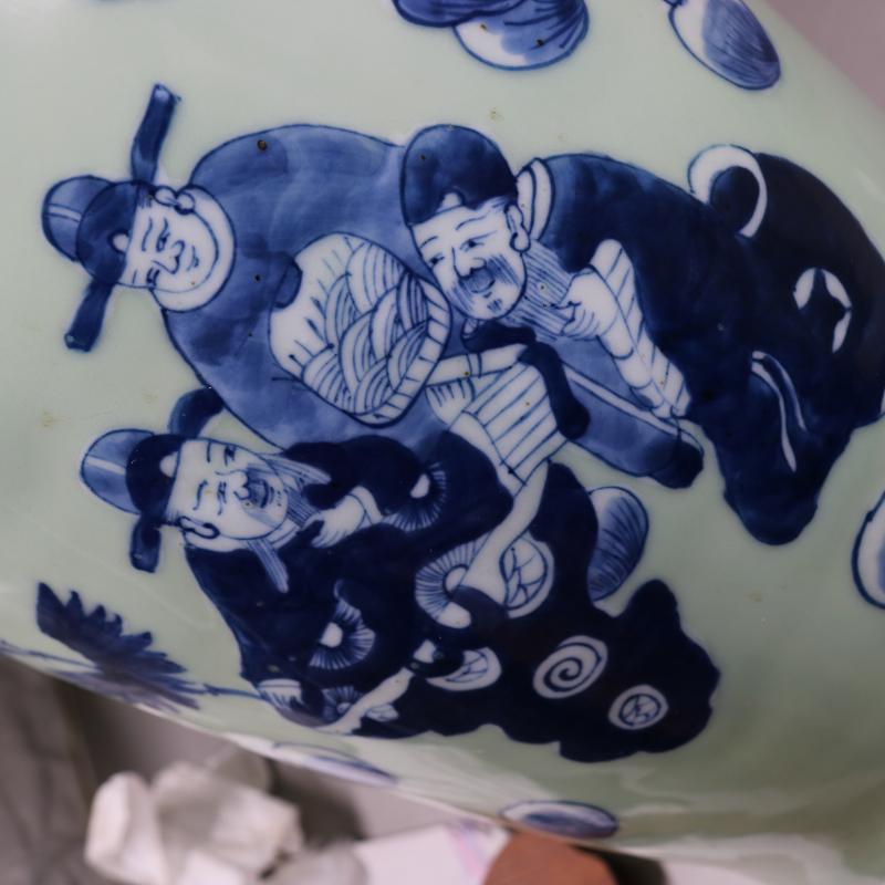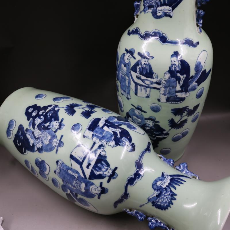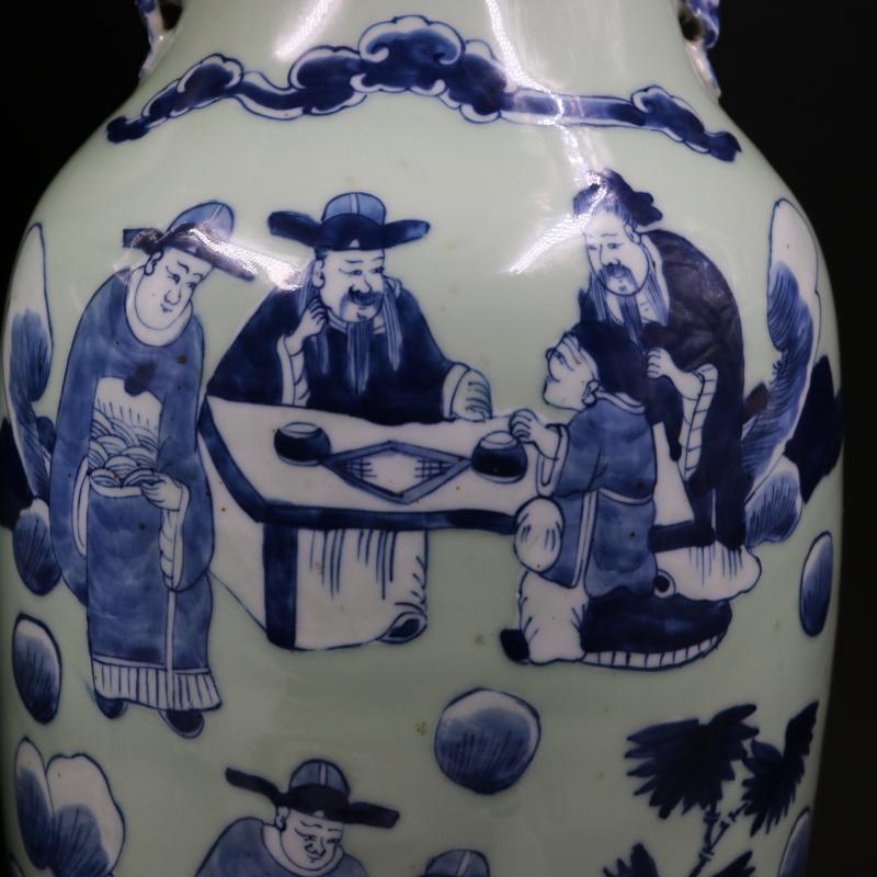 清康熙青花豆青釉人物獅耳瓶仿古瓷器家居裝飾擺件古董古玩收藏1入