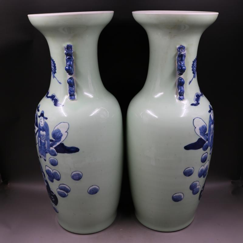 [2]清康熙青花豆青釉人物獅耳瓶仿古瓷器家居裝飾擺件古董古玩收藏1入