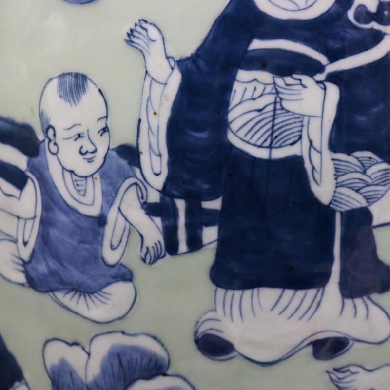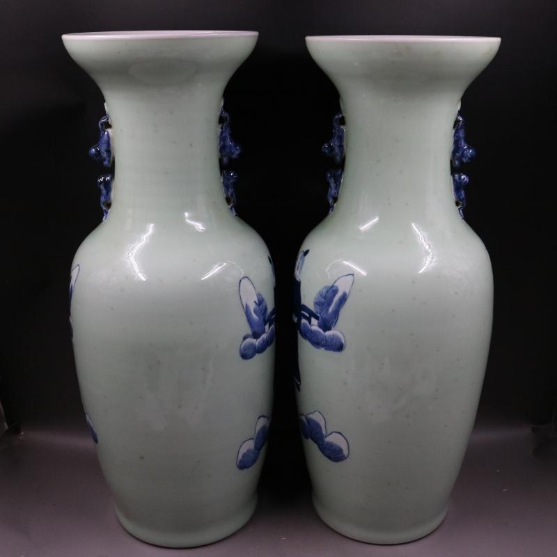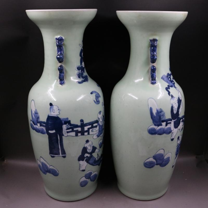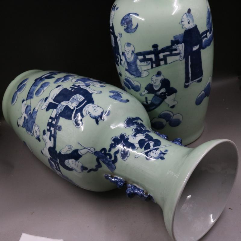 清康熙青花豆青釉人物獅耳瓶仿古瓷器家居裝飾擺件古董古玩收藏1入