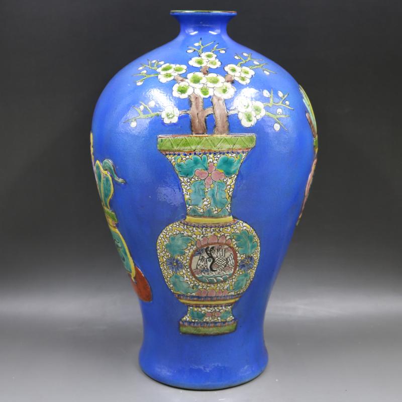 清乾隆浮雕粉彩博古花紋梅瓶手繪仿古老貨瓷器家居擺件古董古玩1入