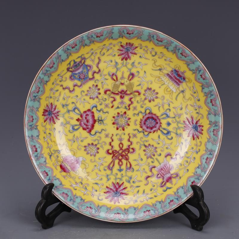 清雍正黃地粉彩描真金福壽有余盤仿古瓷器家居裝飾博古擺件古董古1入