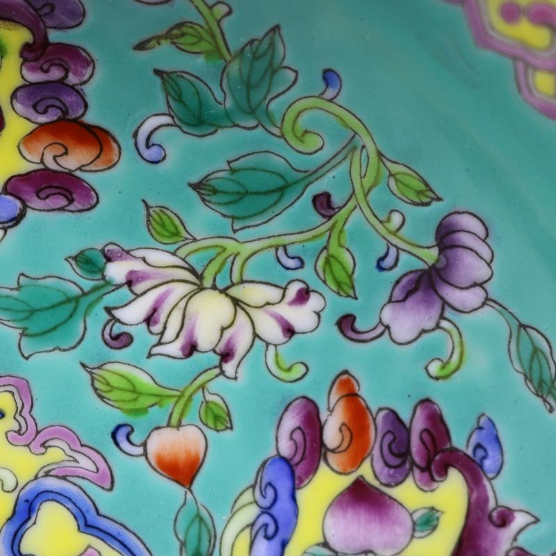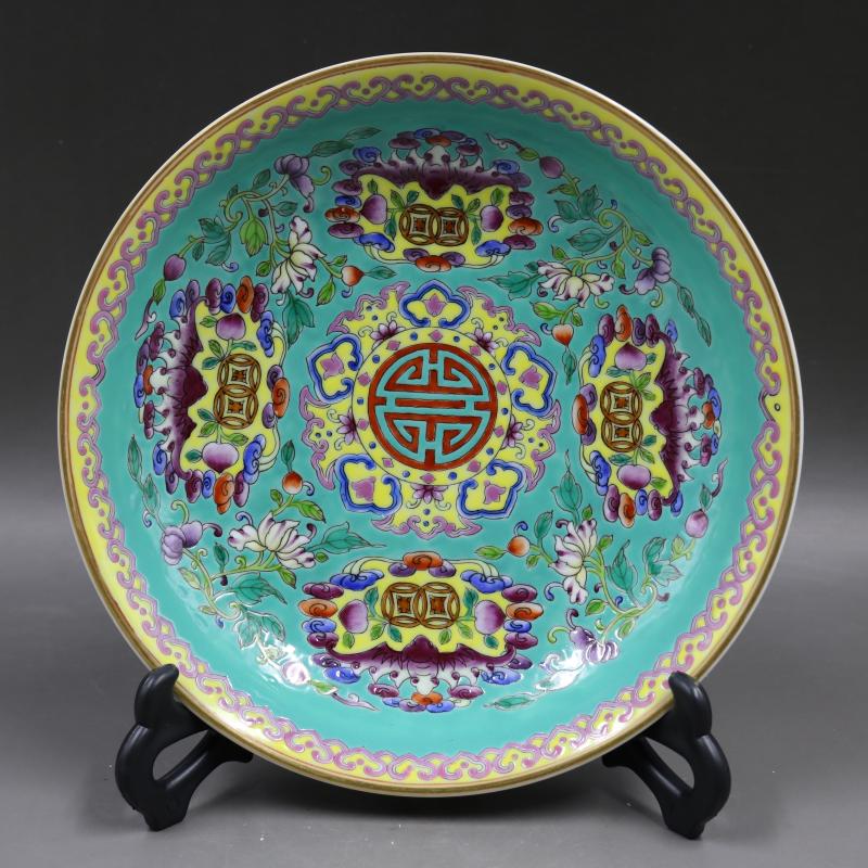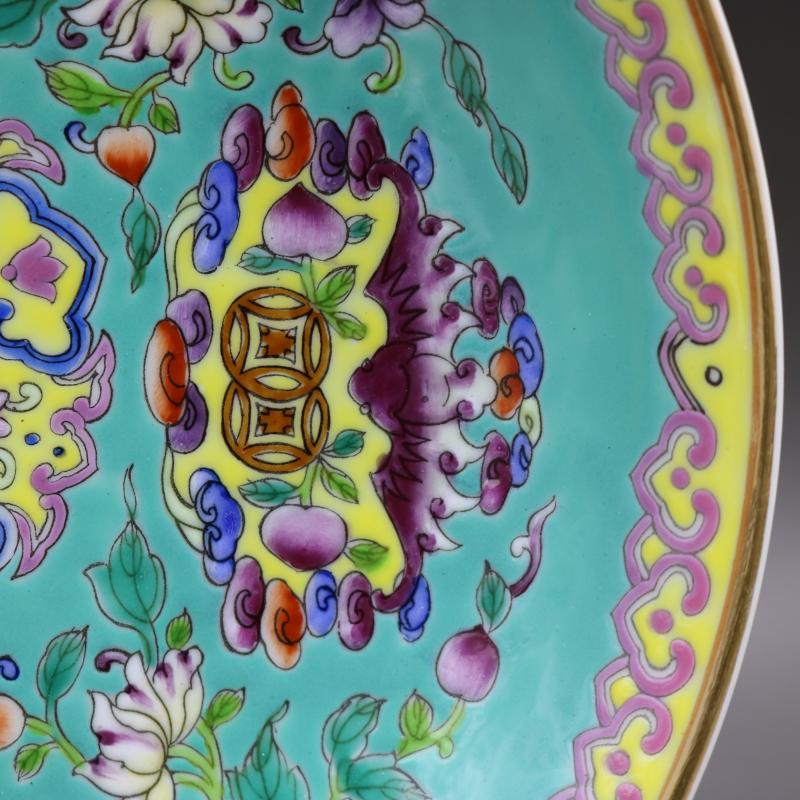 清雍正綠地粉彩描真金壽桃紋盤手工仿古瓷器家居裝飾博古擺件古董1入