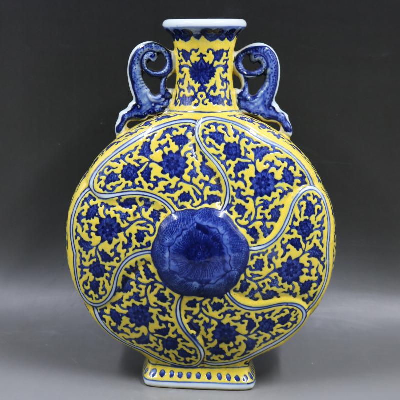 清乾隆黃地青花纏枝蓮紋抱月扁瓶仿古老貨瓷器家居擺件古董古玩1入