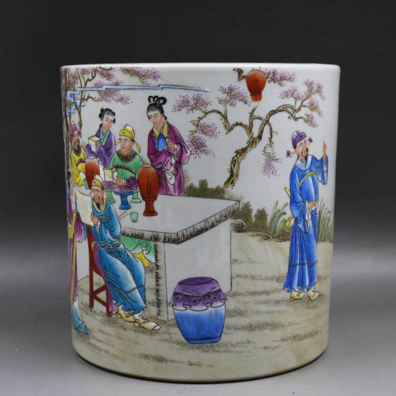 民國粉彩李白桃林夜宴筆筒手繪仿古文房瓷器家居裝飾擺件古董古玩1入