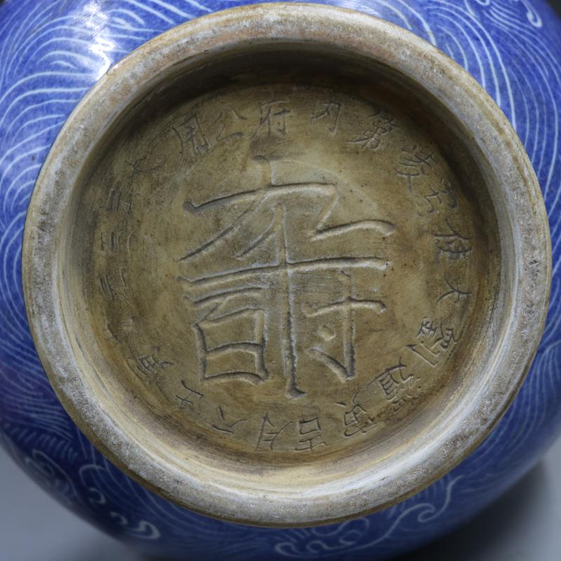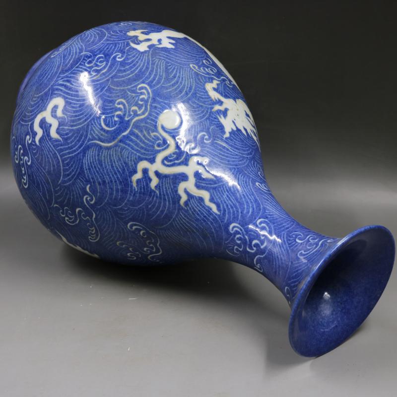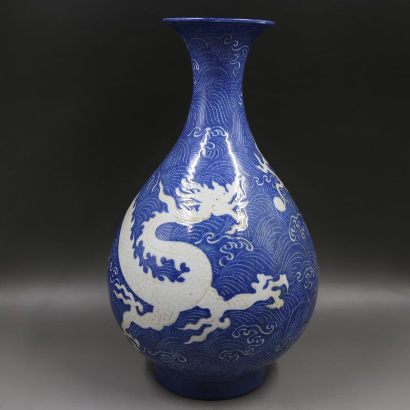 元雪花藍地雕刻水龍紋玉壺春瓶手工仿古工藝瓷器家居裝飾古玩擺件1入