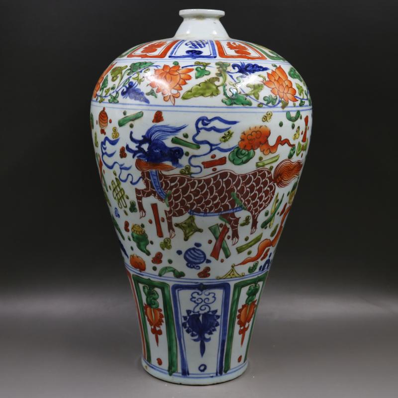 元青花五彩八寶麒麟紋梅瓶手繪仿古家居裝飾老貨瓷器擺件古董古玩1入