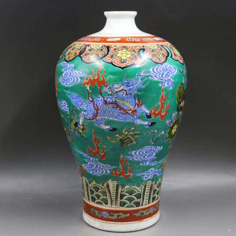 清康熙綠地粉彩麒麟獅紋梅瓶手工雕刻老貨瓷器家居擺件古董古玩1入