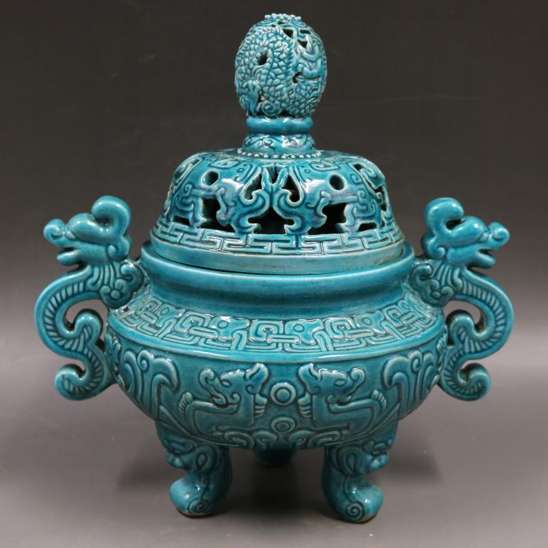 清乾隆綠釉雕刻香薰爐仿古工藝品家居博古架瓷器擺件古董古玩收藏1入