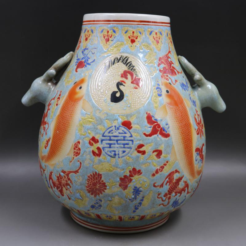 清乾隆夜光瓷粉彩錦鯉紋鹿頭尊福筒仿古工藝瓷器家居擺件古董古玩1入