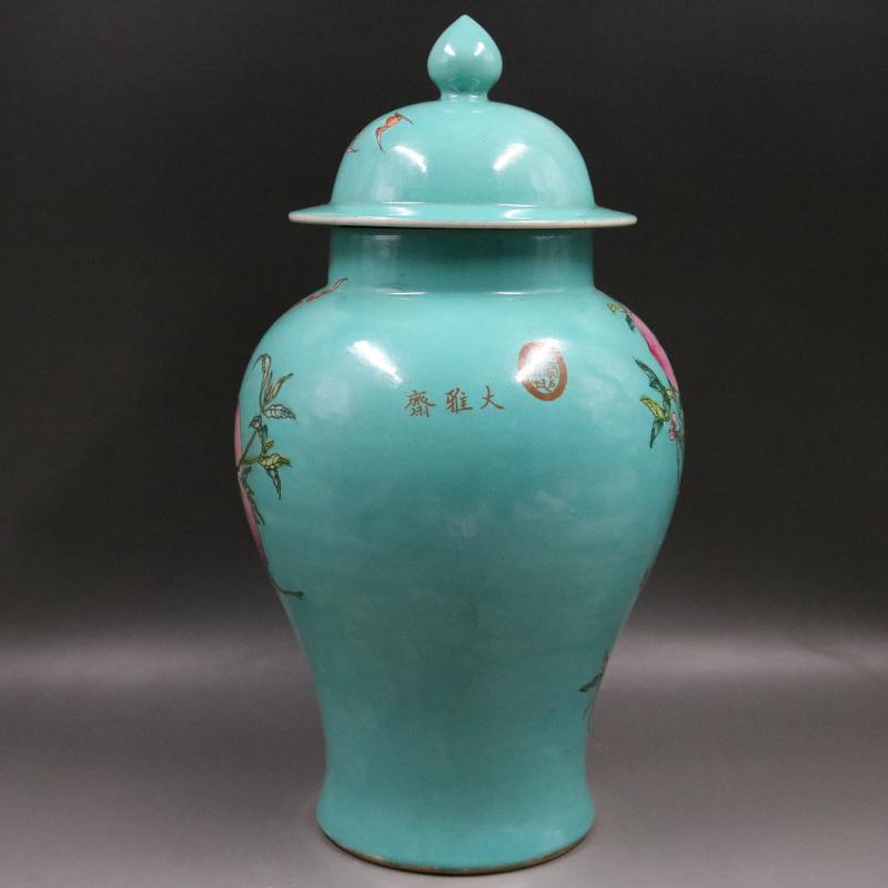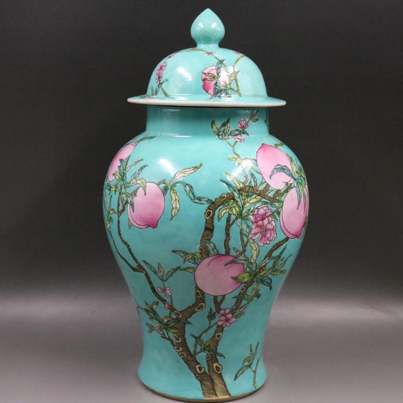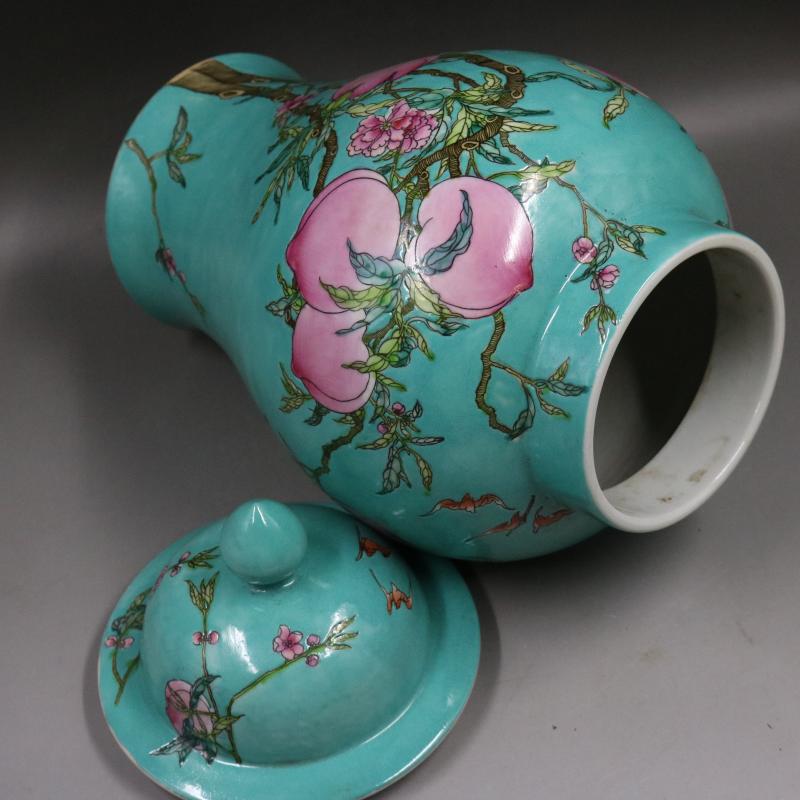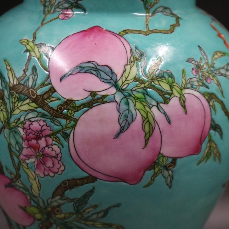 清瓷器時期綠地粉彩九桃紋將軍罐仿古老貨瓷器家居擺件古董古玩1入