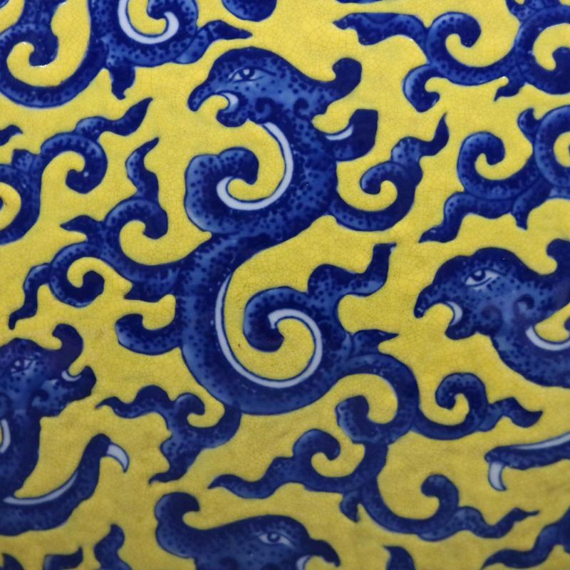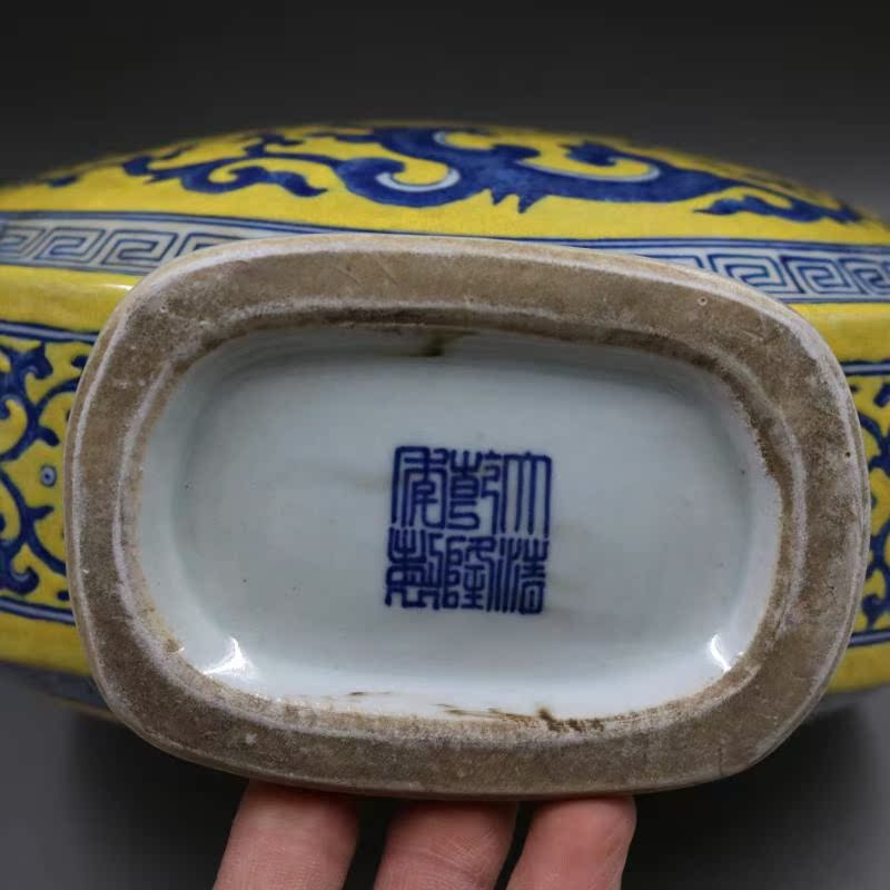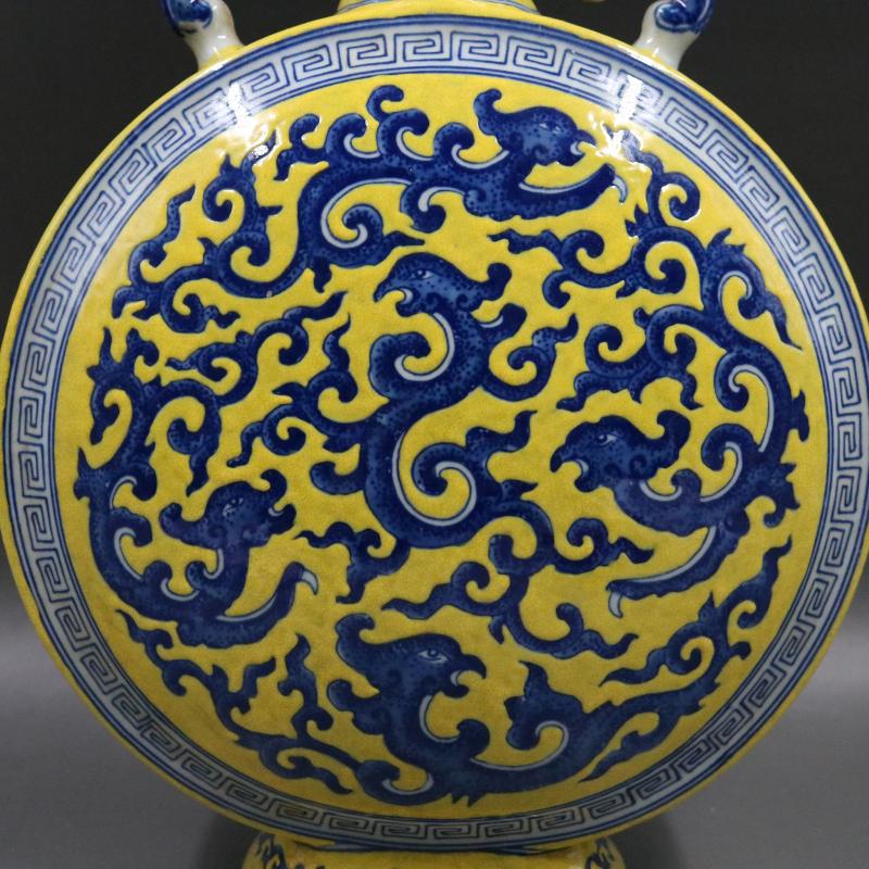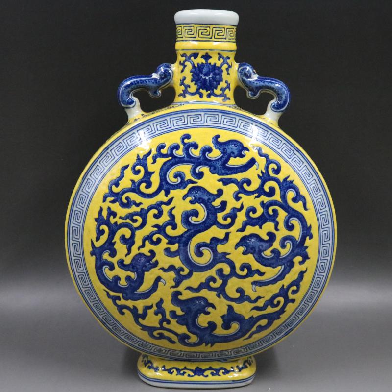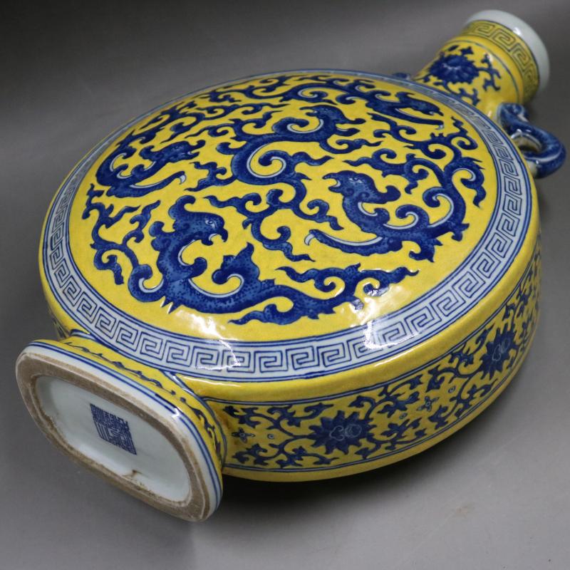 清乾隆黃地青花草花龍紋抱月扁瓶手繪仿古瓷器家居擺件古董古玩1入
