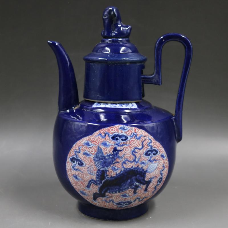 [2]明宣德祭藍青花釉里紅麒麟紋執酒壺仿古家居裝飾擺件瓷器古董古玩1入