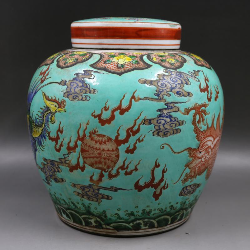 清康熙綠地粉彩龍鳳紋罐仿古工藝品瓷器家居裝飾擺件古董古玩收藏1入