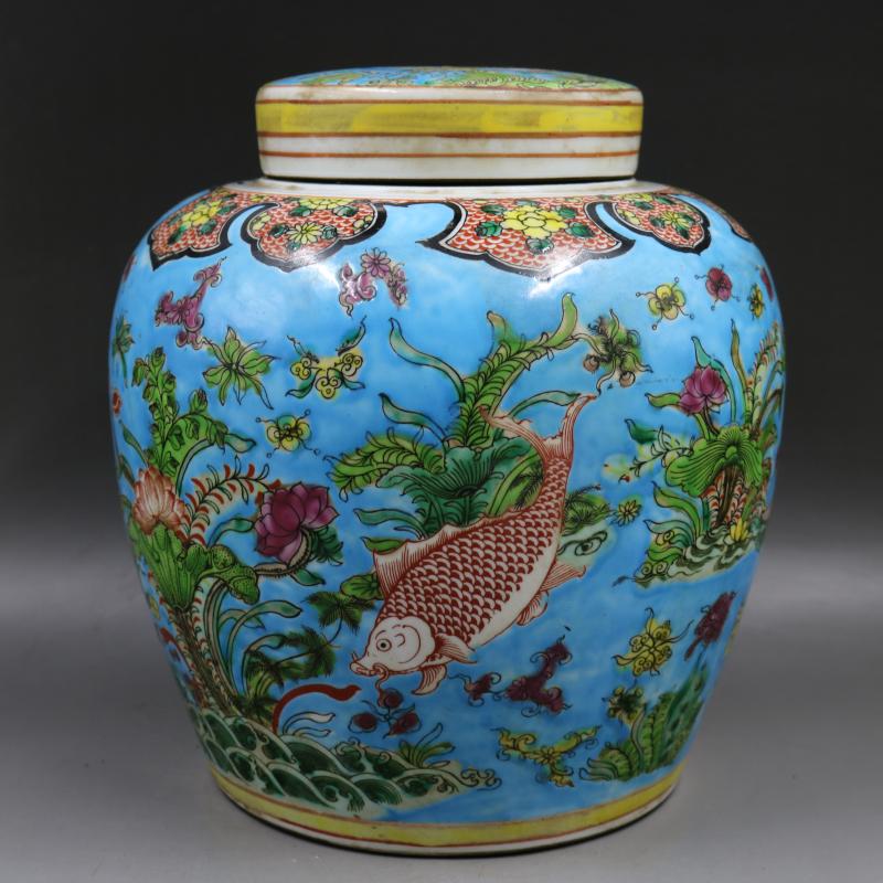 清康熙藍地粉彩荷花魚澡紋罐仿古工藝品瓷器家居擺件古董古玩收藏1入