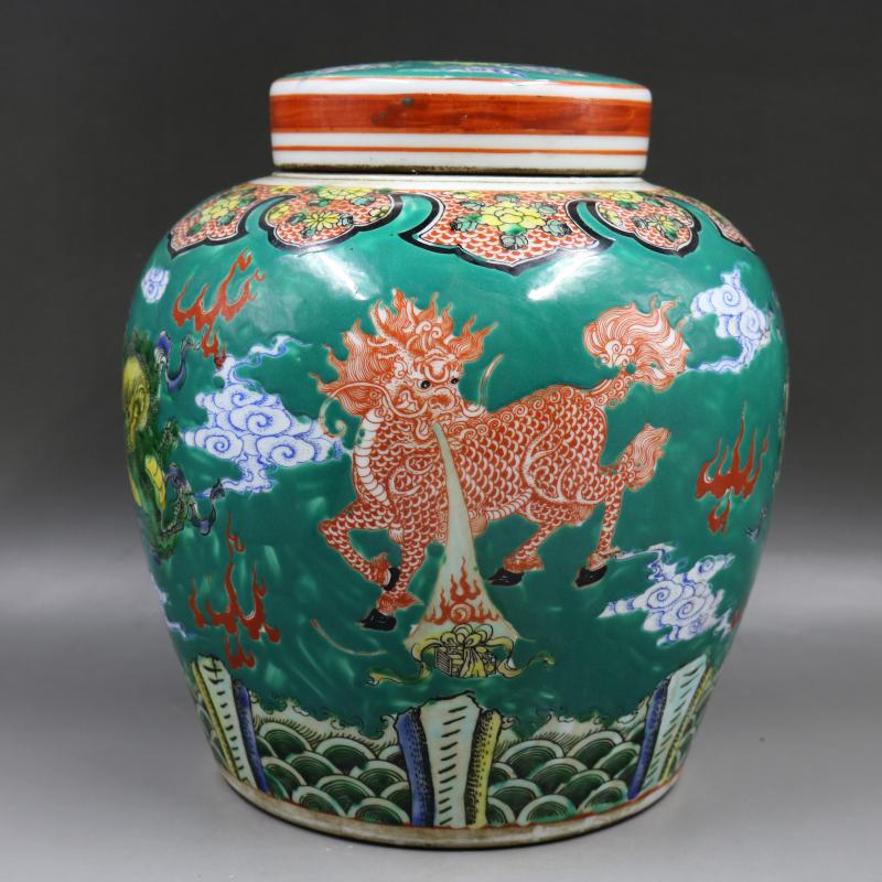 清康熙綠地粉彩麒麟獅子紋罐仿古工藝品瓷器家居擺件古董古玩收藏1入