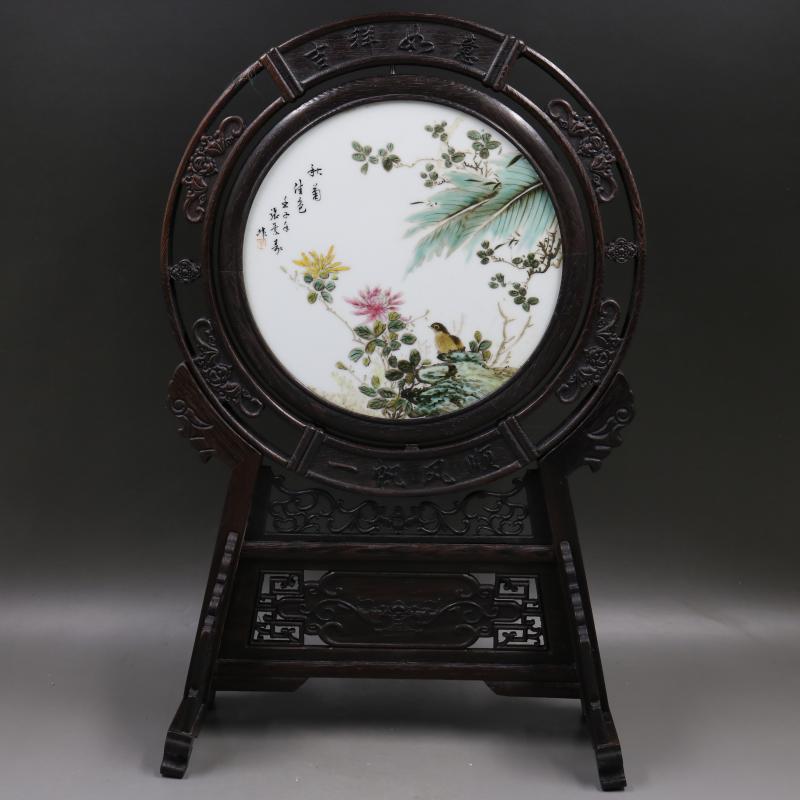 民國粉彩花鳥雞翅木屏風仿古家居裝飾擺件老貨瓷器古董古玩收藏1入