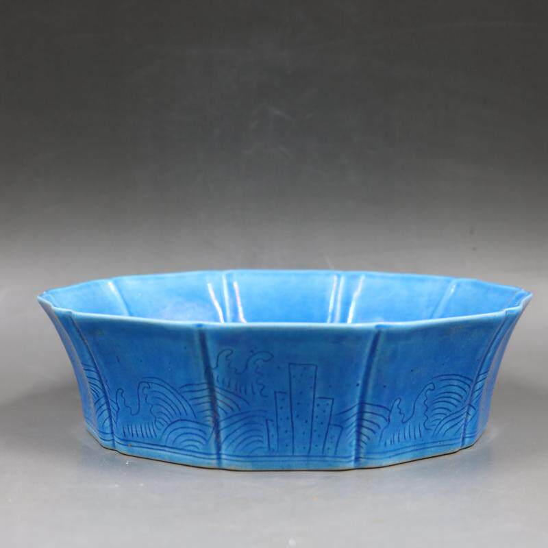 明弘治藍釉刻云龍紋水洗花口盤仿古工藝品瓷器家居擺件古董古玩1入