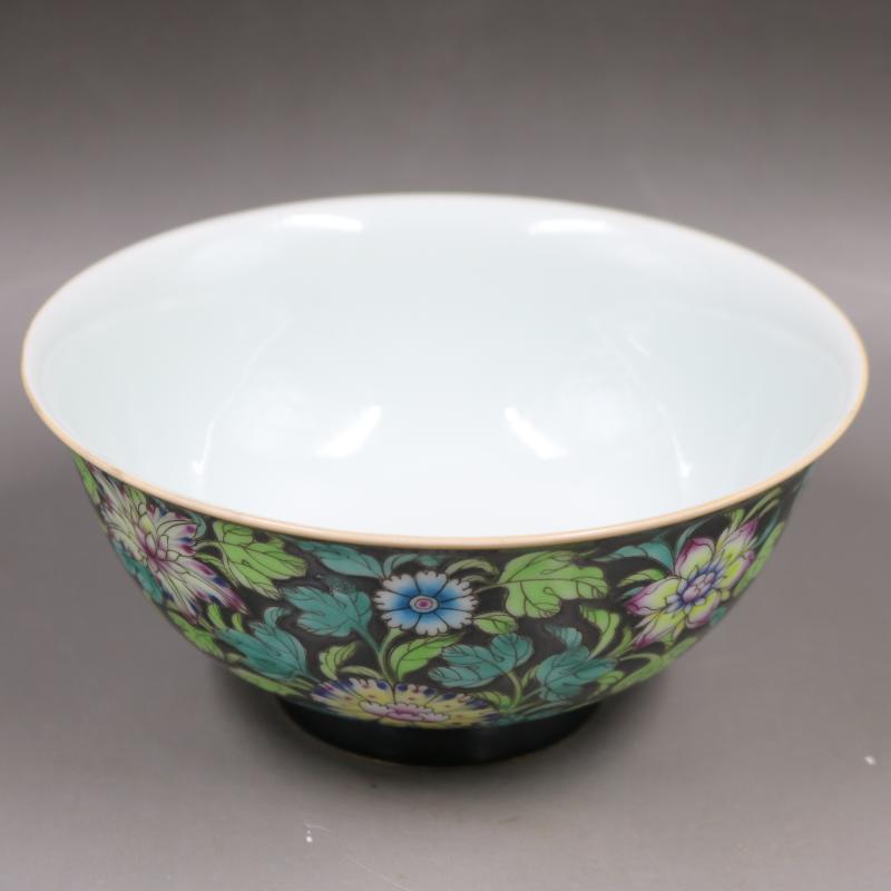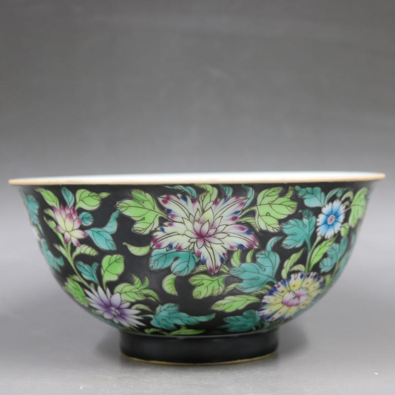 清雍正黑地粉彩描金牡丹花紋碗手繪仿古老貨家居瓷器擺件古董古玩1入